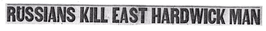 Another historic gem that rates high in excitement – at least for me – happened in 2018. I was working on a project to document the deadliest automobile crashes in Vermont. I discovered one in Newbury from December 11, 1952 when Doctor Stanley Dwinell and his three young sons had died after he drove in front of an oncoming train. It turned out there had been an earlier head-on train wreck at this same crossing on October 30, 1948. I wondered if the earlier wreck had any pertinence to the doctor’s crash. At the Archives, I ordered the newspaper microfilms to see how the earlier train wreck story had been reported in 1948. However, the spectacular, head-on, multiple-fatal, train wreck was NOT the banner headline. What? The headline instead was “Russians Kill East Hardwick Man.”