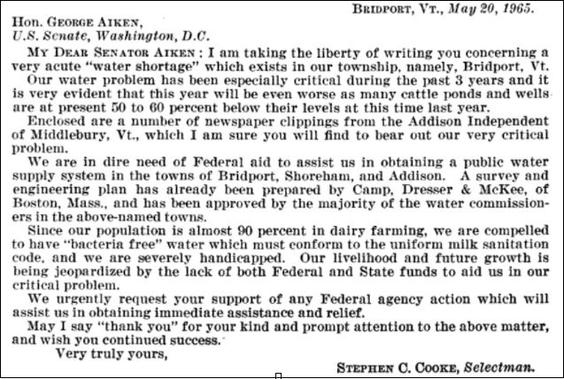 Letter to Senator Aiken from Bridport Selectman Stephen Cooke included in June 18, 1965 hearing on S. 1766, Water Supply Systems and Insured FHA Loans.