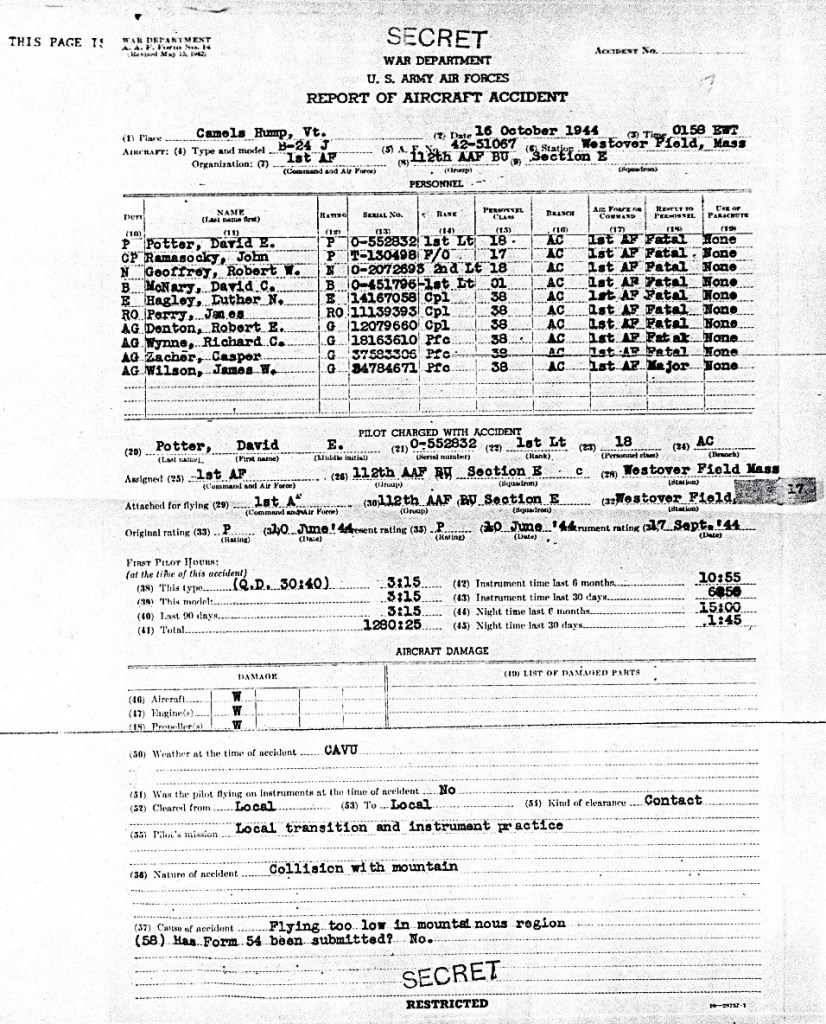 However, in response to a request about the general history of Westover Army Air Field (near Springfield, MA where the bomber was stationed) the U.S.A.F. sent a fantastic 16mm microfilm that provided several quarterly histories covering that airbase during World War Two. And what do you suppose was accidentally included on that microfilm…it was a series of classified Report(s) of Aircraft Accident(s) that involved Westover Field bombers – including the one on Camels Hump! They charged me $6.00. What a deal!!!! I now had the official report with the names of the investigators and the next-of-kin of all the crewmen. This familial information had been archived and provided the basis for the next major step in researching the full story.