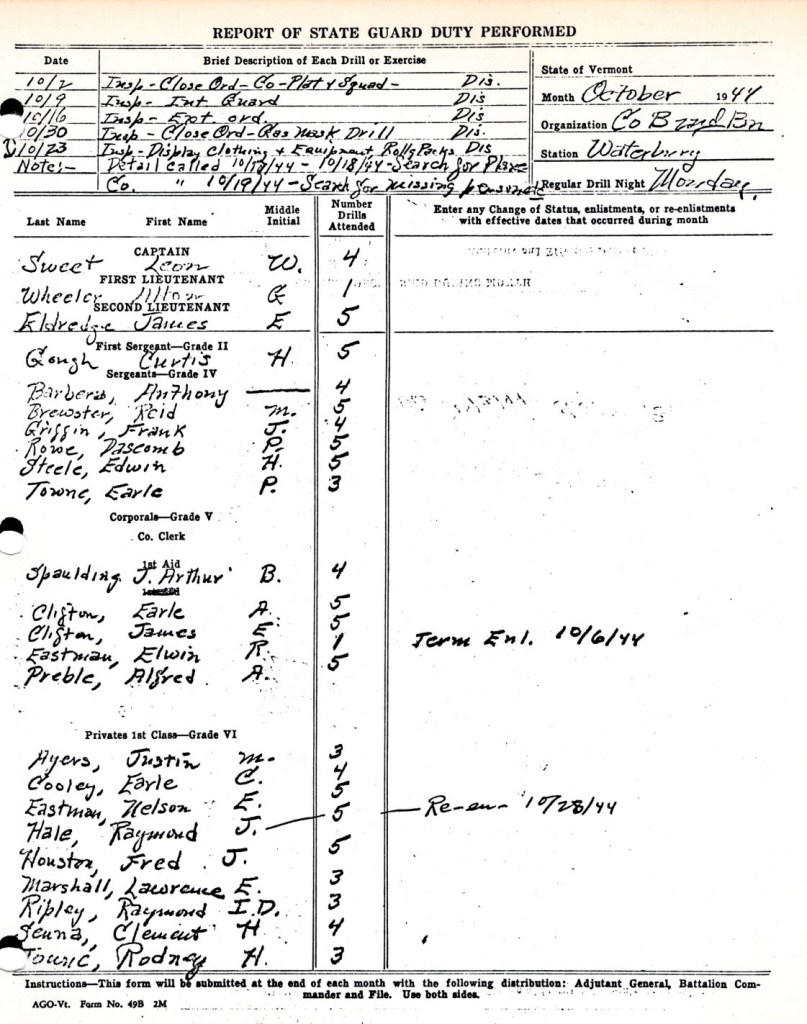 Company B of the Vermont State Guard report of the men involved in recoveryoperations on Camels Hump following the crash.