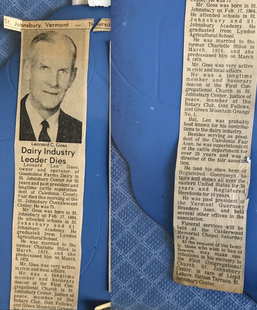 Dairy farmer Leonard Goss’ 1979 obituary from a scrapbook.