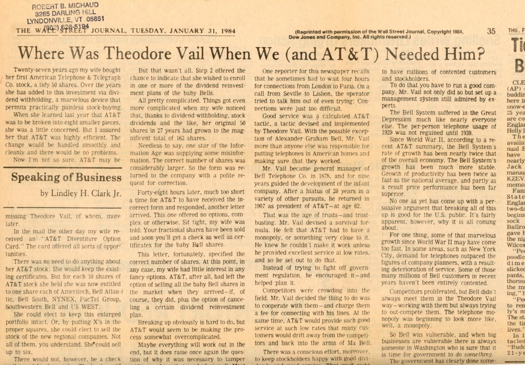 Here’s an article that has a role in the histories of Lyndonville, Vermont; if communications tycoon and philanthropist T. N. (Theodore Newton) Vail; and of Lyndon State College (now NVU-Lyndon). The mailing stamp at the top indicates, fortunately, that it came from the files of Lyndon State College collector Robert “Bob” Michaud. The “Wall Street Journal” heading is a deceptive tease—this is actually a reprint in the Caledonian-Record, February 2, 1964, which the paper clipping can demonstrate, on its flip side. A quick photo of the page is better than nothing, but clearly a flatbed scan image is better. Alas, there will be no link online for this, for a while. The Caledonian-Record website at present offers access (for subscribers) to only 1837-1926 (free search but a fee to download) or from 1997 forward, but it’s patchy, and the Vail article doesn’t show up. Well, two out of three is a promising start.