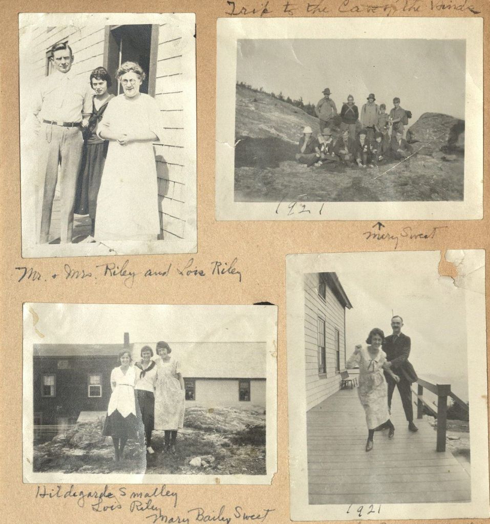 A portion of a page devoted to photos of Mary Sweet and friends at the Summit House in 1921. Sweet worked as assistant manager and hostess for the Mt. Mansfield Company from 1949-1957.