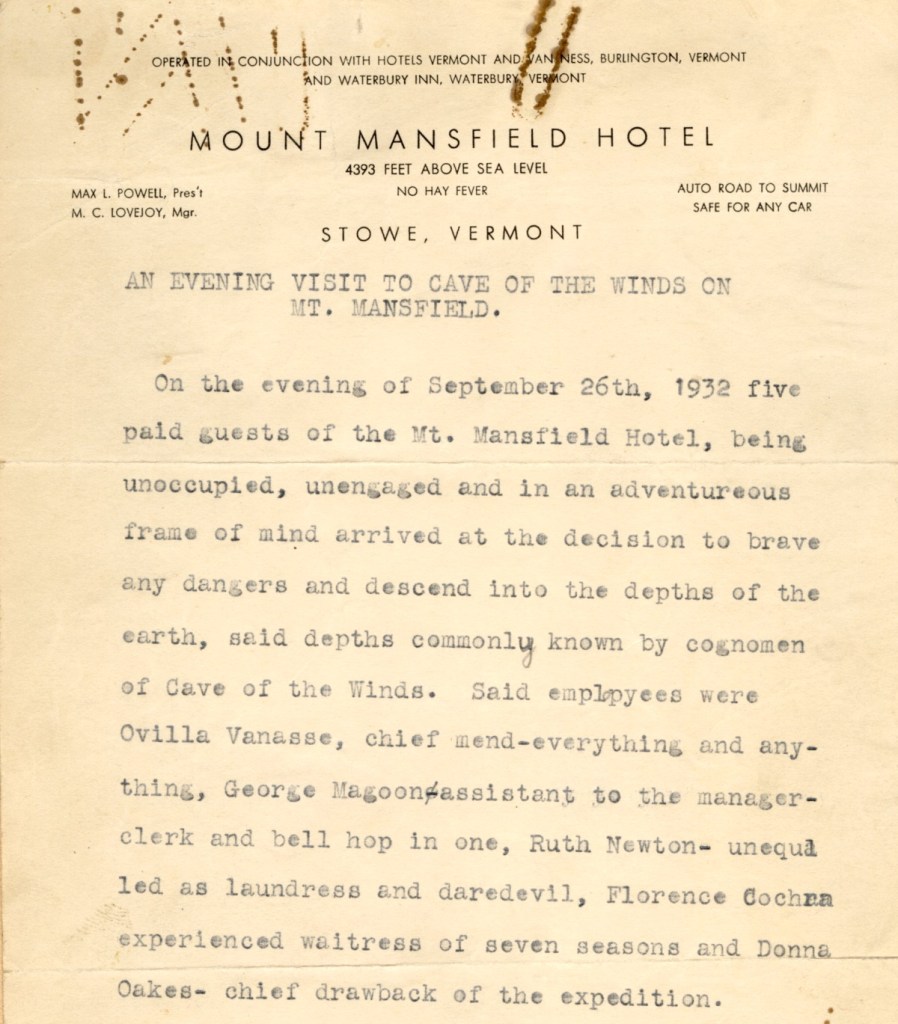 The scrapbook contains several first-person stories about visiting one of the mountain’s unique attractions, the Cave of the Winds, including a humorous account that involved five hotel employees in 1932. “The eventful trip,” they wrote, “is the first to be made at night as far as the record shows and will be long remembered and talked of.” They made sure to record the challenges they faced in the cave, such as descending over a 25-foot ice slide “in sitting position.”