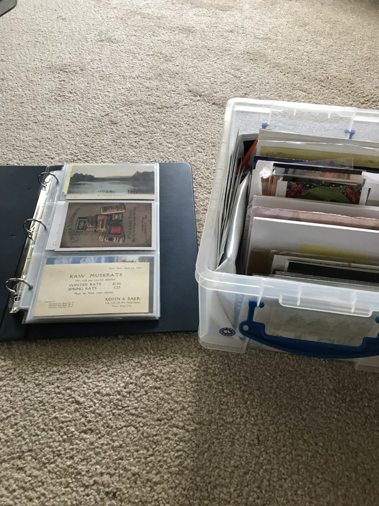 Storing vintage postcards is much simpler today than even a few years ago. Two good storage systems are shown here: a loose-leaf album with pages that have see-through pockets for the postcards, and a secure moisture-resistant container that can be divided into labeled section for larger numbers of cards. The loose-leaf album’s big advantages show up when you take it to a gathering or simply pull it out to show an archive visitor: It’s simple to examine the cards, front and back, without handling or damaging them. Using a separate album for each topic or donor adds to the value of this method.