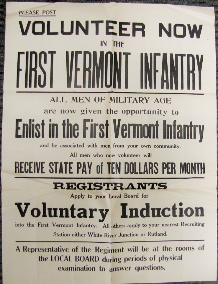 When the United States entered the First World War in 1917, the call for new recruits went out on a national scale and many government agencies, including in Vermont, played their part to support this endeavor. This recruitment poster, issued by the Office of the Adjutant and Inspector General in 1917, calls upon Vermont men of military age to enlist in the First Vermont Infantry. It details the benefits of enlistment, in terms not only of pay, but also in serving with men from their own communities, and it provides those interested with the details they needed to apply.