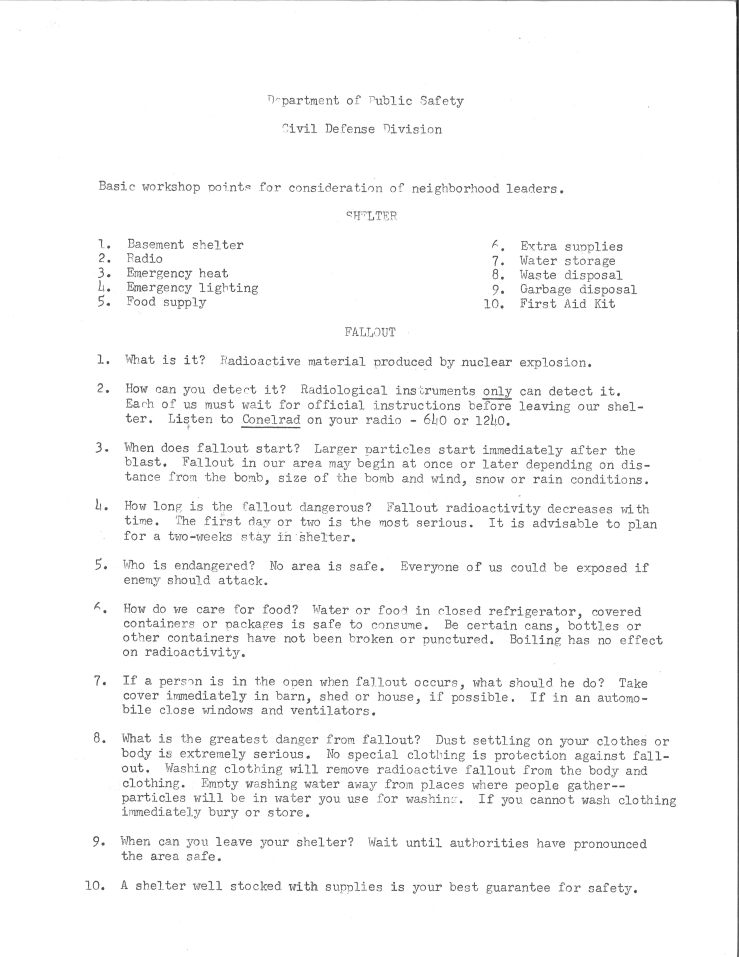 Organizing a civil defense effort was a hyper-local affair, with individual communities creating and maintaining their own plans and procedures for dealing with disaster. Vermont’s Civil Defense Division created this list of practical information for neighborhood leaders organizing efforts in their local communities. The information includes suggested shelter supplies, facts about fallout, basic first aid procedures, and tips for home fire prevention, as well as a rule-of-thumb for radiation decay. The Division was in operation from its creation in 1951 until 1985, when it was officially redesignated as the Division of Emergency Management. (View the entire document)