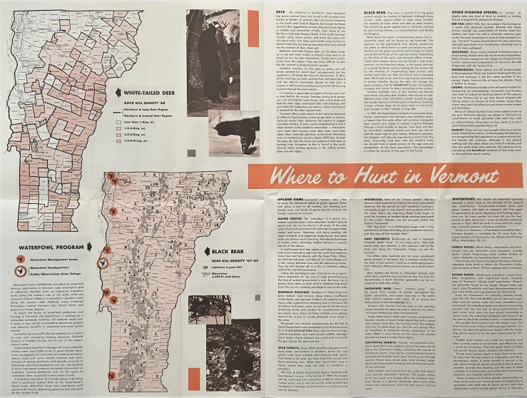 This pamphlet was distributed by the Vermont Department of Fish and Game and contains hunting license information, indicators for Waterfowl Management Areas, and shows the public lands open to hunting. It also contains kill density maps for white-tailed deer and bear in 1967-1968. This guide also offers information on where to hunt in Vermont for small game, recommendations for how to plan one’s hunt, and provides an informative piece on the history of deer hunting in the state and how herd populations ebb and flow. (View the entire document)