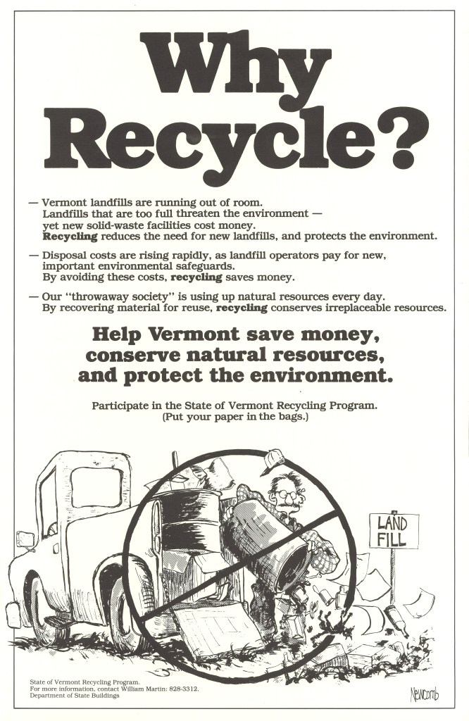 This poster from the Department of State Buildings cites the dwindling space in Vermont landfills, the increasing disposal costs, and the natural resources being used up by the “throwaway society.” It encourages residents to participate in the State of Vermont Recycling Program to help conserve resources, reduce the need for new landfills, and protect the environment.