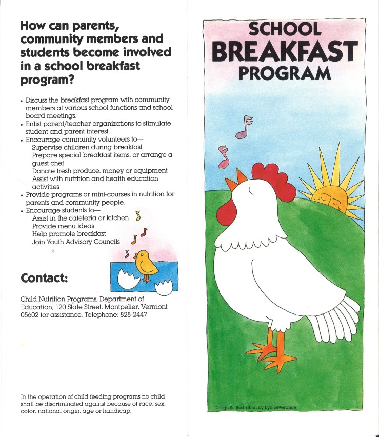 This pamphlet was distributed by the Vermont Department of Education’s Child Nutrition Programs to explain how the School Breakfast Program may be implemented within schools across the state. Information presented focuses on how the staff of the Child Nutrition Program can assist in the launch of breakfast programs, requirements of the program to receive funding, and how to engage the local community in supporting a breakfast program at their own schools. Included are original illustrations by Lyn Severance which are incorporated into the pamphlet’s design. (View the entire document)
