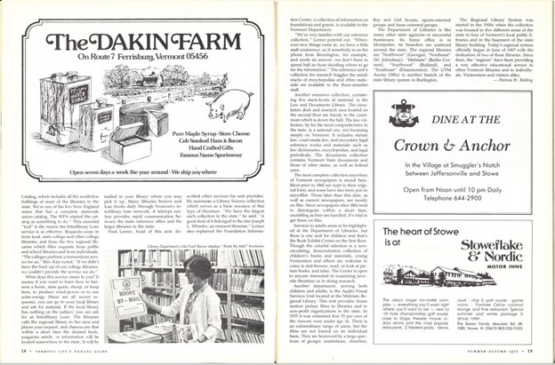As a publication of Vermont Department of Tourism and Marketing, Vermont Life provided the opportunity for different branches of state government to have their work featured in a widely-read publication. This article, which reports on the services not only of Vermont’s local public libraries, but also that of the Vermont Department of Libraries, was co-written by Patricia W. Belding, who served as a librarian at the Aldrich Library in Barre, Vermont from 1967 to 1993. (View the entire article)