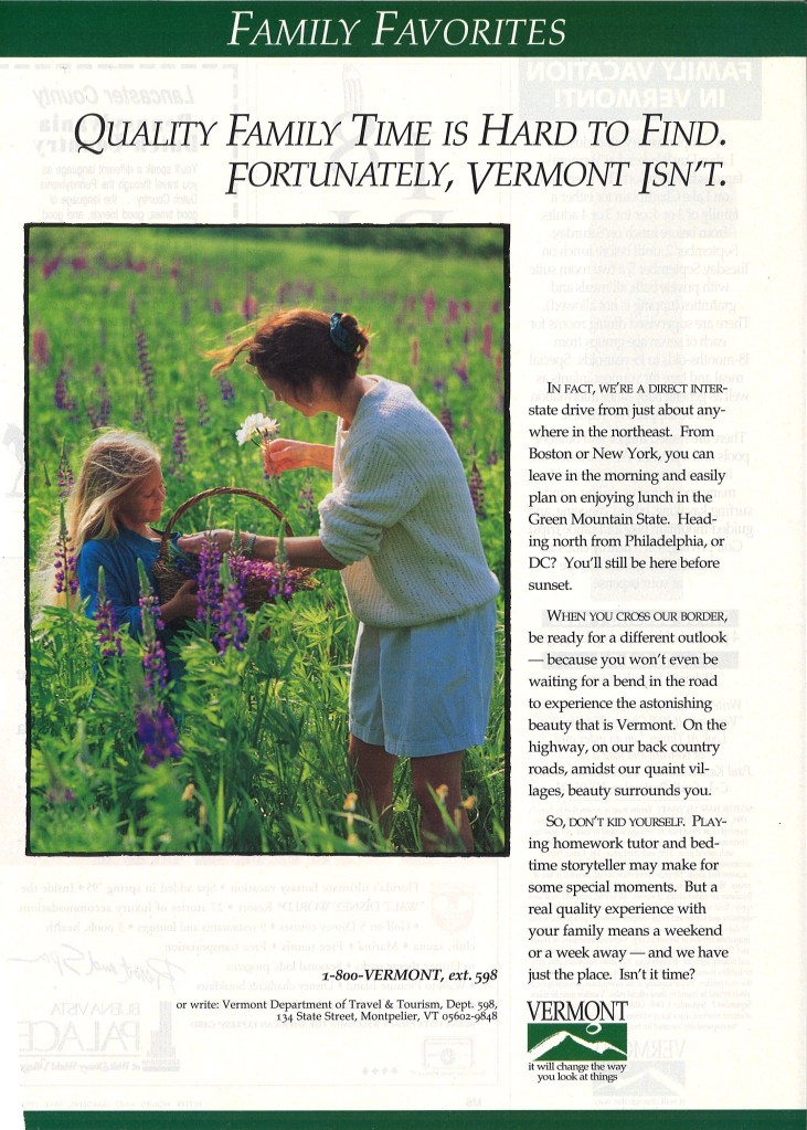This advertisement in Better Homes and Gardens’ May 1995 issue supplement paints Vermont as an idyllic retreat not far away from the hustle and bustle of the Northeast’s metropolitan areas. The Vermont Department of Tourism and Marketing, as well as its predecessors, have cast the allure of Vermont as a vacation destination far and wide. In the summer 1995 season alone, print ads were placed in such publications as Better Homes & Gardens, Country Home, Yankee Magazine,the Boston Globe, the New York Times, and other regional newspapers. Video slots were seen during commercial breaks of prominent shows such as Headline News, CBS This Morning, the Today Show, and on regional news stations.